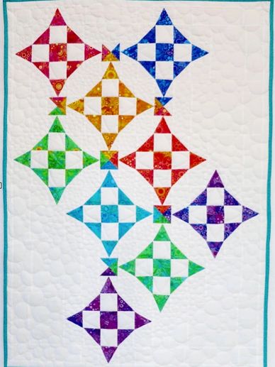 Combining Triangle in a Square patches with Pieced Triangle Squares gives the illusion of curves without any curved piecing. The Stars are brought together with Quarter Square patches. Your patchwork will dance across the Background!